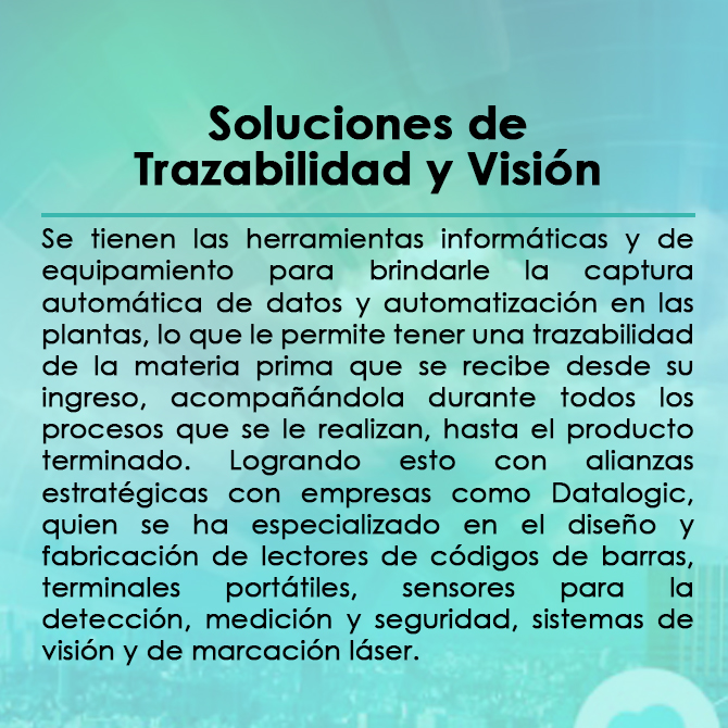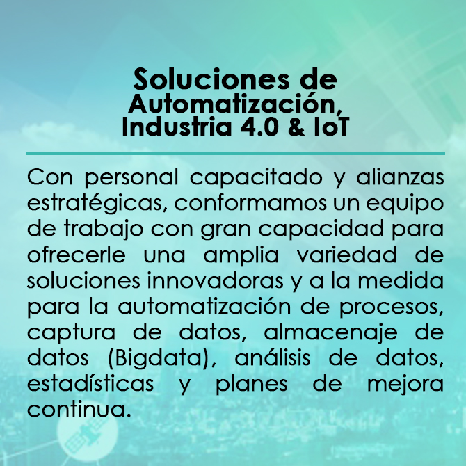 Nos apasiona ofrecerles a nuestros clientes los mejores resultados, con soluciones que impacten en sus métricas de manera positiva para eficientar con calidad, profesionalismo e innovación sus procesos, utilizando herramientas de industria 4.0, trazabilidad, telecomunicaciones y tecnologías estratégicas.